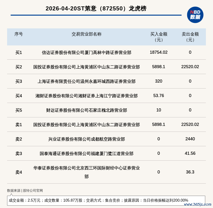 每经讯,2026年4月20日,新三板基础层公司ST第意(872550,收盘价:0.02元)登上龙虎榜,交易方式是集合竞价,披露原因是当日价格振幅达到200.00%,成交数量105.87万股,成交金额2.5万元。买一席位为信达证券股份有限公司厦门高林中路证券营业部,买入1.88万元;卖一席位为国投证券股份有限公司上海黄浦区中山东二路证券营业部,卖出2.25万元。