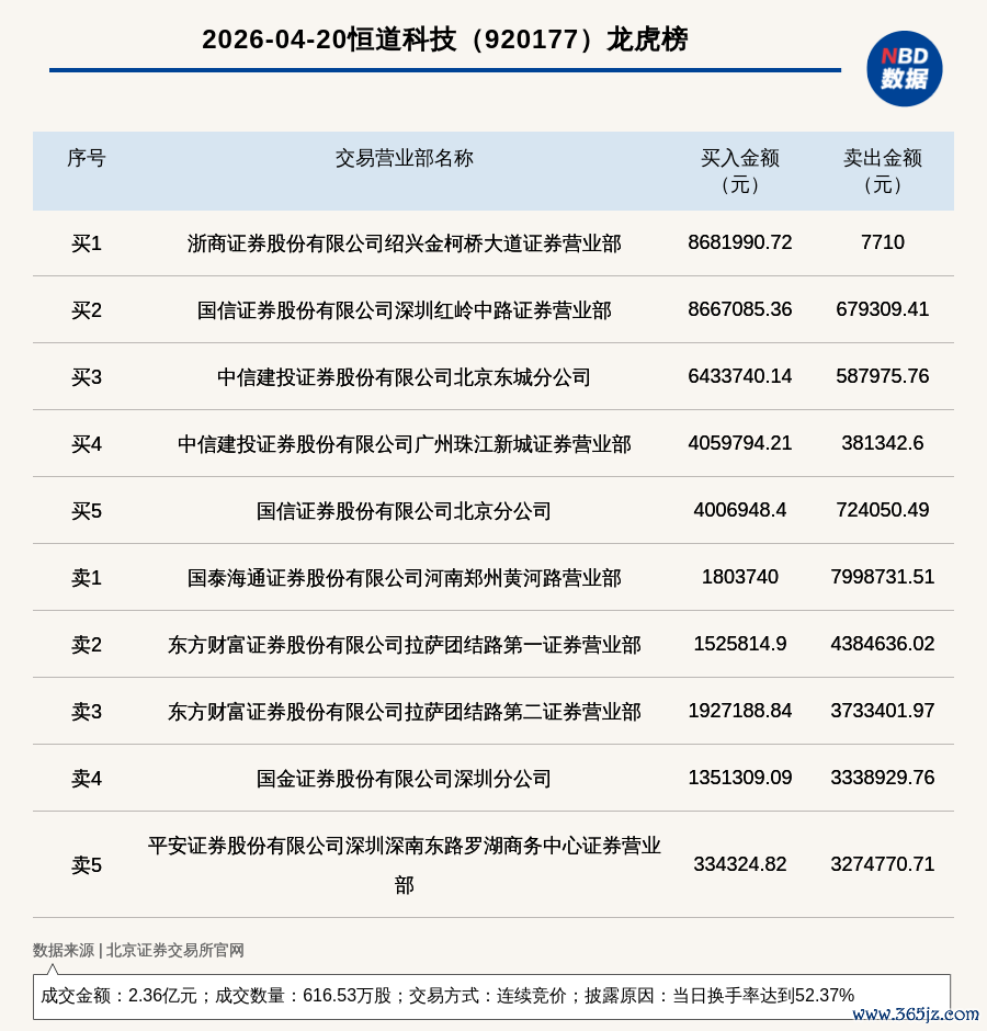每经讯,2026年4月20日,北交所上市公司恒道科技(920177,收盘价:38.35元)登上龙虎榜,交易方式是连续竞价,披露原因是当日换手率达到52.37%,成交数量616.53万股,成交金额2.36亿元。买一席位为浙商证券股份有限公司绍兴金柯桥大道证券营业部,买入868.2万元;卖一席位为国泰海通证券股份有限公司河南郑州黄河路营业部,卖出799.87万元。